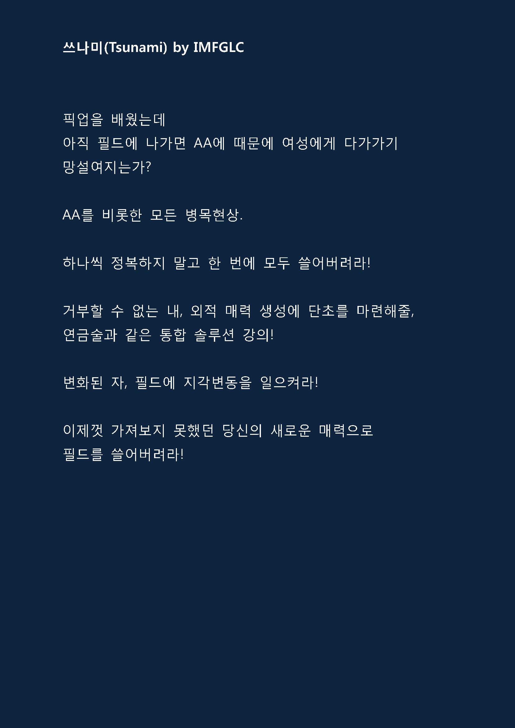 [10.5(토)/Junior Class/실전워크숍] 당신의 마음 속 깊은 곳에서부터의 근본적인 변화, "쓰나미(Tsunami)". 필드를 쓸어버릴 블록버스터급 플레이어/픽업아티스트 양성 프로젝트!